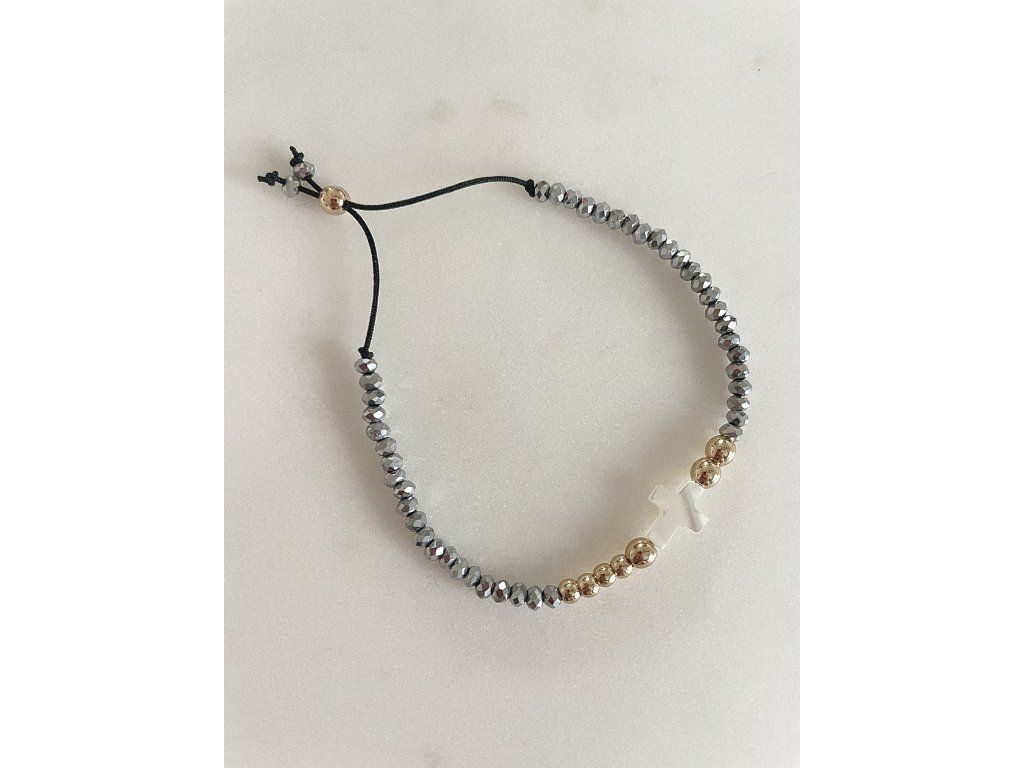 Materiál: 0,8mm černá, nylonová šňůrka, 0,2mm skleněné, broušené korálky, křížek z mušle, hematit pozlacený.